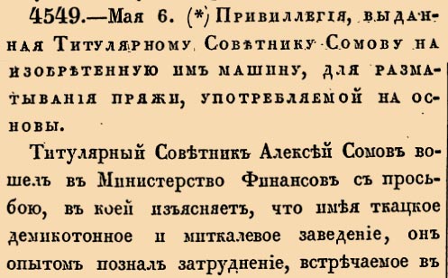 Титулярный Советник Алексей Сомов вошел в Министерство Финансов с просьбою, в коей изъясняет, что имея ткацкое демикотонное и миткалевое заведение, он опытом познал затруднение, встречаемое в разматывании изготовленной и оклеенной основной бумаги с мотков на катушки или шпули, с коих уже снуются основы. Во избежание сего, он Сомов двухлетними трудами и значительными иждивениями изобрел разматывальную машину, доныне еще нигде несуществующую; а потому просит, на основании Высочайшаго Манифеста 1812 года Июня 17 дня, выдать ему на 10 лет привилегию на исключительное право употреблять и устроивать означенную машину во всех областях Российской Империи <….>