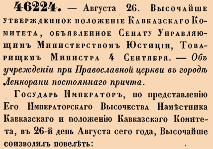 46224. 1868 год. 7 сентября (26 августа ст.ст.) Высочайше утвержденное положение Кавказского Комитета, объявленное Сенату Управляющим Министерством Юстиции, Товарищем Министра 4 Сентября.Об учреждении при Православной церкви в городе Ленкорани постоянного причта
