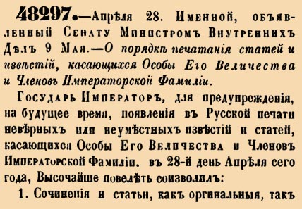 Государь Император, для предупреждения, на будущее время, появления в Русской печати неверных или неуместных известий и статей, касающихся Особы Его Величества и Членов Императорской Фамилии, в 28-й день Апреля сего года, Высочайше повелеть соизволил:
