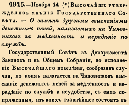 Государственный Совет в Департаменте Законов и в Общем Собрании, во исполнении Высочайшего повеления, сообразив случаи, по коим налагается на Чиновников взыскание денежных пеней за медленность и нерадение по службе и неудобства, с сим сопряженные, из коих главнейшее состоит в том, что взыскание таковое, пополняясь вычетом жалования, отягощает Чиновников в способах содержания и дает повод к злоупотреблению, мнением положил: 1) В тех случаях, когда по силе общих узаконений о денежных пенях с Чиновников по службе, следовать будет наложить оную, поступать вместо сего следующим образом: а) За просрочку в исполнении предписаний Начальства, допущенную без объяснения законных причин, делать строгий выговор<...>