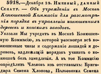 Указали Мы учредить в Москве Конюшенную Коммисию, в которой разсмотря все конюшенные чины и содержание лошадей и деревень, надлежащий порядок учинить о конюшне без замедления. А в тое Коммисию определить Членов из отставных: Бригадира Семена Хлопова, Полковника Семена Полозова, Подполковника Василья Олешева, из Царедворцев Якова Никифорова; и повелеваем Нашему Сенату учинить о том по сему Нашему указу.