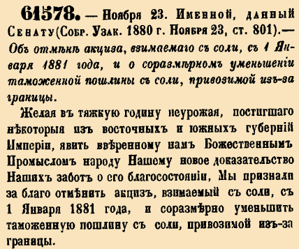61578. 1880 год. 23 ноября (5 декабря). Именный, данный Сенату. Об отмене акциза, взимаемого с соли, с 1 Января 1881 года, и о соразмерном уменьшении таможенной пошлины с соли, привозимой из-за границы