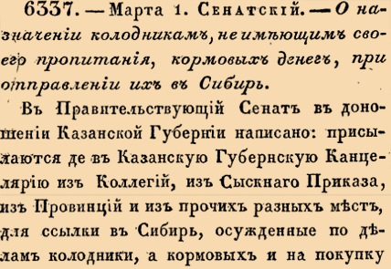 6337. 1733 год. 12 марта (1 марта ст.ст.) Сенатский. О назначении колодникам, неимеющим своего пропитания, кормовых денег, при отправлении их в Сибирь. В Правительствующий Сенат в доношении Казанской Губернии написано: присылаются де в Казанскую Губернскую Канцелярию из Коллегий, из Сыскного Приказа, из Провинций и из прочих разных мест, для ссылки в Сибирь, осужденные по делам колодники, а кормовых и на покупку провианта денег на тех колодников не присылают <…>