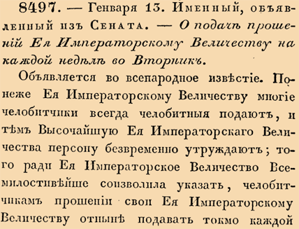 8497. 1742 год. 13 января (24 января). Именный, объявленный из Сената. О подаче прошений Ея Императорскому Величеству на каждой неделе во Вторник.