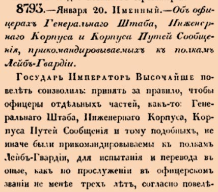Государь Император Высочайше повелеть соизволил: принять за правило, чтобы офицеры отдельных частей, как-то: Генеральнаго Штаба, Инженернаго Корпуса, Корпуса Путей Сообщения и тому подобных, не иначе были прикомандировываемы к полкам Лейб-Гвардии, для испытания и перевода в оные, как по прослужении в офицерском звании не менее трех лет <…>
