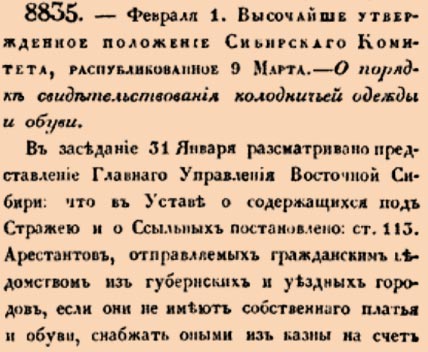 8835. 1836 год. 13 февраля (1 февраля ст.ст.). Высочайше утвержденное положение Сибирскаго Комитета, распубликованное 9 Марта. О порядке свидетельствования колодничьей одежды и обуви.В заседание 31 Января разсматривано представление Главнаго Управления Восточной Сибири: что в Уставе о содержащихся под Стражею и о Ссыльных постановлено: ст.113. Арестантов, отправляемых гражданским ведомством из губернских и уездных городов, если они не имеют собственнаго платья и обуви, снабжать оными из казны на счет экстраординарных губернских сумм по росписанию <…>