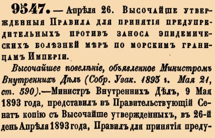 9547. 1893 год. 26 апреля (8 мая). Высочайше утвержденныя Правила для принятия предупредительных против заноса эпидемических болезней мер по морским границам Империи