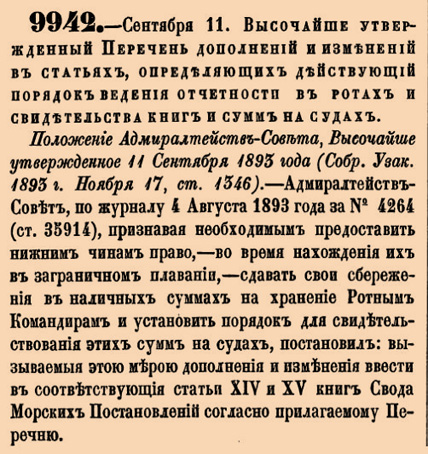 9942. 1893 год. 23 сентября (11 сентября ст.ст.) Высочайше утвержденный Перечень дополнений и изменений в статьях, определяющих действующий порядок ведения отчетности в ротах и свидетельства книг и сумм на судах При отправлении роты в плавание наличная харчевая сумма вносится в Сберегательную Кассу Государственнаго Банка на книжку, которая вместе с таковыми же книжками нижних чинов сдается на хранение Командиру экипажа под квитанцию с экипажной печатью и за скрепою Экипажнаго Казначея. Эта квитанция предъявляется при каждом свидетельстве книги