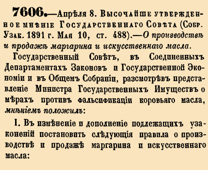 7606. - Апреля 8. Высочайше утвержденное мнение Государственного Совета, 1891 год.О производстве и продаже маргарина и искусственного маслаГосударственный Совет, в Соединенных Департаментах Законов и Государственной Экономии и в Общем Собрании, рассмотрев представление Министра Государственных Имуществ о мерах против фальсификации коровьего масла, мнением положил:I. В изменение и дополнение подлежащих узаконений постановить следующие правила о производстве и продаже маргарина и искусственного масла:1. Под названием «маргарин», в смысле настоящего закона, разумеется продукт, получаемый из свежего говяжьего жира выделением из него части стеарина по способу Меж-Мурье. Под наименованием «искусственное масло» разумеется продукт, получаемый при обработке по способу Меж-Мурье ста весовых частей маргарина со ста весовыми частями молока или с десятью весовыми частями сливок.