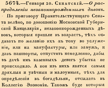 5674. — Января 20. Сенатский, 1731 год.О распределении незаконнорожденных девокПо приговору Правительствующего Сената велено, по доношению Московской Губернской Канцелярии, незаконнорожденных девок, которые пришли в возраст, тех отдавать по желанию их к тому в услужение, или на мануфактуры, или замуж, и дав пашпорты, отпустить немедленно, дабы в даче им казенных денег убытка не происходило. А кои из них явятся самые дряхлые и увечные и малоумные, тех для определения в богадельни, отсылать в Коллегию Экономии. Також буде которые ещё и в совершенный возраст не пришли, и пожелают кто их к себе в домы взять во услужение.