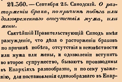 24360. 1810 год. 7 октября (25 сентября ст.ст.) Синодский. О расторжении брака, по причине побега или долговременнаго отсутствия мужа, или жены<…> Первоначальная прозьба от мужа или жены о расторжении брака и о дозволении вступить во второе супружество по причине или побега или отсутствия и неизвестности котораго либо из лиц сих, должна быть подана или прислана к Епархиальному Преосвященнику от самаго мужа или жены <…>
