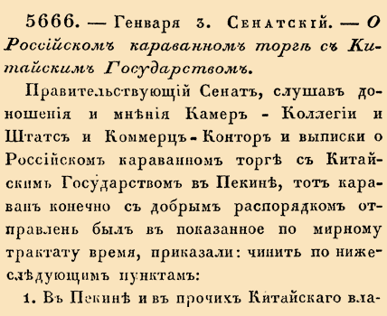 Правительствующий Сенат, слушав доношения и мнения Камер-Коллегии и Штатс и Коммерц-Контор и выписки о Российском караванном торге с Китайским Государством в Пекине, тот караван конечно с добрым распорядком отправленбыл в показанное по мирному трактату время, приказали: чинить по нижеследующим пунктам: