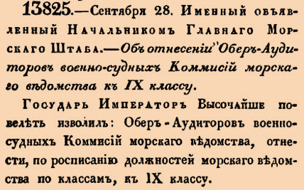 13825. 1840 год. 9 октября (28 сентября ст.ст.) Именный, объявленный Начальником Главнаго МорскагоШтаба. Об отнесении Обер-Аудиторов военно-судных Коммисий морскаго ведомства к IX классу Государь Император Высочайше повелеть изволил: Обер-Аудиторов военно-судных Коммисий морскаго ведомства, отнести, по росписанию должностей морскаго ведомства по классам, к IX классу