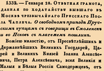 1332. — Генваря 28. Отвѣтная грамота, данная по ходатайству бывшаго въ Москвѣ чрезвычайнаго Прусскаго Посла Чаплича. - О свободномъ приѣздѣ Прусскимъ купцамъ съ товарищи въ Смоленскъ и во Псковъ съ платежемъ пошлинъ.