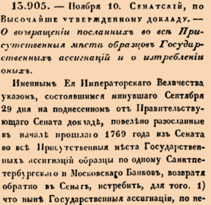 Именным указом Ея Императорского Величества, изданным 29 сентября на основании доклада Правительствующего Сената, повелено: образцы государственных ассигнаций Санкт-Петербургского и Московского банков, разосланные в начале прошлого 1769 года из Сената во все государственные учреждения (по одному экземпляру), вернуть обратно в Сенат и уничтожить. Это решение принято по следующим причинам: