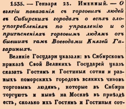 1535.- Генваря 23. Именный.- О взятіи показанія съ торговыхъ людей и въ Сибирскихъ городахъ о всѣхъ злоупотребленіяхъ по управленію и о притѣсненіяхъ торговымъ людямъ отъ бывшихъ тамъ Воеводами Князей Гагариныхъ.