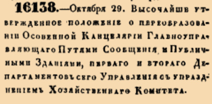 16138.—Октября 29. ВЫСОЧАЙШЕ УТВЕРЖДЕННОЕ ПОЛОЖЕНІЕ о преобразованіи Особенной Канцеляріи Главноуправляющаго Путями Сообщенія и Публичными Зданіями, ПЕРВАГО И ВТОРАГО ДЕПАРТАМЕНТОВЪ СЕГО УПРАВЛЕНІЯ СЪ УПРАЗДНЕНІЕМЪ ХОЗЯЙСТВЕННАГО КОМИТЕТА.