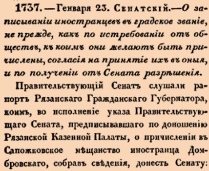 Правительствующій Сенатъ слушали рапортъ Рязанскаго Гражданскаго Губернатора, коимъ, во исполненіе указа Правительствующаго Сената, предписывавшаго по доношенію Рязанской Казенной Палаты, о причисленіи въ Сапожковское мѣщанство иностранца Домбровскаго, собравъ свѣденія, донесть Сенату: было ли о желаніи его Домбровскаго поступить въ оное мѣщанство, объявлено тамошнему обществу, и буде было объявлено, то почему изъявили согласіе на принятіе его только 20 человѣкъ мѣщанъ, тогда, какъ оныхъ состоитъ 745 душъ? доноситъ, что по собраннымъ имъ Губернаторомъ свѣденіямъ, открылось, что дѣло о причисленіи иностранца Домбровскаго въ Сапожковское мѣщанство, въ Казенной Палатѣ началось по сообщенію Рязанскаго Губернскаго Правленія, въ слѣдствіе поданнаго о томъ отъ Домбровскаго прошенія, по предписанію Казенной Палаты. Сапожковскій Городовый Магистратъ донесъ, что на принятіе его въ тамошнее мѣщанское общество, изъ числа 745 душъ мѣщанъ, согласилось только 20 человѣкъ; прочіе же не подписались не по чему другому, какъ по незнанію поведенія его Домбровскаго: ибо, какъ тотъ Магистратъ доноситъ ему Губернатору, мѣщане ни принять его, ни отказать въ томъ не могли. Указами же Правительствующаго Сената повелѣно: 1-мъ 1781 года Іюля, 28 дня, въ сходство указа отъ 16 (10) Генваря 1773 года, всѣмъ плѣннымъ, оставшимся въ Россіи по принятіи Православнаго закона съ жен нами ихъ, хотя бы они и на крѣпостныхъ чьихъ либо женщинахъ или дѣвкахъ женаты были, съ дѣтьми ихъ быть свободными и дать имъ во волю избрать такой родъ жизни, какой сами заблагоразсудятъ на пользу общую и для своего собственнаго пропитанія. 2-мъ, 1783 года Октября 20 числа, со всѣми оказавшимися при послѣдней переписи разныхъ народовъ вольными людьми, безъ изъятія рода и закона, поступить по точной силѣ выше сего изъясненнаго указа, оставляя имъ свободу избрать такой родъ жизни, какой сами они за благоразсудятъ на пользу общую и для собственнаго своего пропитанія, то есть, согласно съ Манифестомъ 17 Марта 1775 года, написать ихъ въ купечество и мѣщанство или службу Государственную, кто куда пожелаетъ и способенъ явится, а отнюдь ихъ ни за кѣмъ не укрѣплять. 3-мъ, 1797 года Октября 26 дня, чтобъ всякій пребывающій въ Россіи избралъ непремѣнно какой-либо извѣстный родъ состоянія, дабы каждый неизъемлемо по званію своему несъ повинно. сти, закономъ опредѣляемыя. 4-мъ, 14 Маія 1824 года, что каждый иностранецъ, принявшій присягу на подданство Россіи и предъявляющій о томъ законное свидѣтельство, долженъ быть приписанъ по изъявленному имъ желанію въ мѣщанство и цехъ, какъ Россійскій уже подданный, съ тѣмъ однако жъ, чтобы о каждомъ таковомъ иностранцѣ, вступившемъ въ подданство Россіи, для утвержденія по объявленному желанію въ мѣщанскомъ или цеховомъ званіи, согласно 4 пункту указа 27 Маія 1807 года, представляемо было Казенными Палатами Правительствующему Сенату. Онъ Губернаторъ, соображая обстоятельства дѣла сего съ вышеприведенными узаконеніями, съ своей стороны находитъ, что Казенная Палата причисленіи иностранца Домбровскаго въ Сапожковское мѣщанство, поступила правильно, и съ тѣми законами согласно, въ особенности же съ указомъ 14 Маія 1824 года, которымъ именно предписывается, чтобъ иностранцевъ, присягнувшихъ на вѣчное подданство Россіи, приписывать въ мѣщанство и цехи, но чтобы требовать отъ оныхъ о