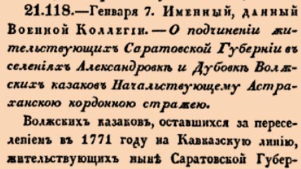Волжскихъ казаковъ, оставшихся за переселеніемъ въ 1771 году на Кавказскую линію, жительствующихъ нынѣ Саратовской Губерніи въ селеніяхъ Александровкѣ и Дубовкѣ, Повелѣваю подчинить всѣхъ Начальствующему Астраханскою кордонною стражею ГенералъМаіору Завалишину, отъ котораго зависѣть у уже будетъ и употребленіе ихъ на службу, по его разсмотрѣнію.