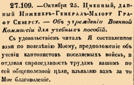 27.109. — Октября 25. ИМЕННЫЙ, ДАННЫЙ ИНЖЕНЕРЪ-ГЕНЕРАЛЪ-МАІОРУ ГРАФУ СИВЕРСУ. — Объ учрежденіи Военной Коммиссіи для учебныхъ пособій.