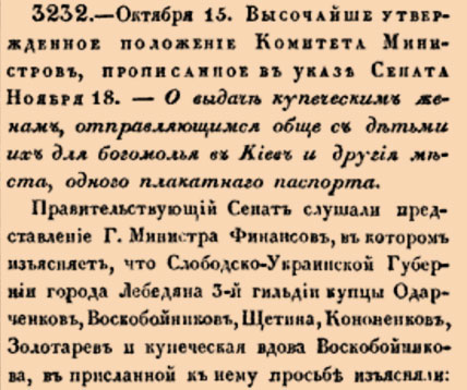 Правительствующий Сенат заслушал представление господина министра финансов, в котором разъясняется, что купцы 3-й гильдии города Лебедяна Слободско-Украинской губернии Одарченков, Воскобойников, Щетина, Кононенков, Золотарев и купеческая вдова Воскобойникова в присланной ему просьбе поясняли: что их жены, а также дети и внуки, иногда находясь в болезненном состоянии, дают обет отправиться после выздоровления в город Киев для поклонения святым мощам; однако воздерживаются от этого исключительно из-за возросшей цены на паспорта для купцов 3-й гильдии, за которые указом от 24 ноября 1821 года велено платить по 25 рублей. Поэтому они и просили, принимая во внимание указанную надобность, для которой из их семейств отправляются в Киев по четыре и более человека, разрешить выдавать женам, детям и несовершеннолетним внукам месячные и двухмесячные билеты, установленные Высочайшим указом от 6 декабря 1827 года.