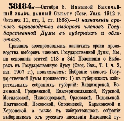 Именной высочайший указ, данный Сенату (Собрание узаконений 1912 г. 11 октября, отд. I, ст. 1868). — О назначении сроков проведения выборов членов Государственной Думы в губерниях и областях.
