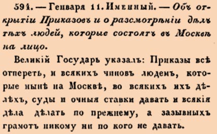 594.- Генваря 11. Именный.- Объ открытіи Приказовъ и о разсмотрѣніи дѣлъ тѣхъ людей, которые состоятъ въ Москвѣ на лицо.