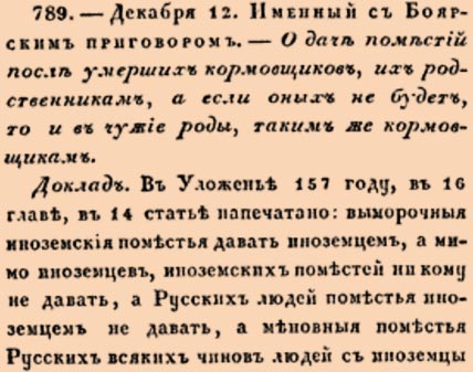 789.- Декабря 12. Именный съ Боярскимъ приговоромъ.- О дачѣ помѣстій послѣ умершихъ кормовщиковъ, ихъ родственникамъ, а если оныхъ не будетъ, то и въ чужіе роды, такимъ же кормовщикамъ.