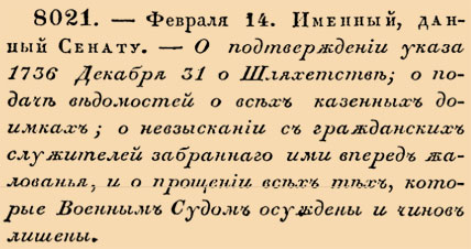 8021.- Февраля 14. Именный, данный Сенату.- О подтвержденіи указа 1736 Декабря 31 о Шляхетствѣ; о подачѣ вѣдомостей о всѣхъ казенныхъ доимкахъ; о невзысканіи съ гражданскихъ служителей забраннаго ими впередъ жалованья, и о прощеніи всѣхъ тѣхъ, которые Военнымъ Судомъ осуждены и чиновъ лишены.