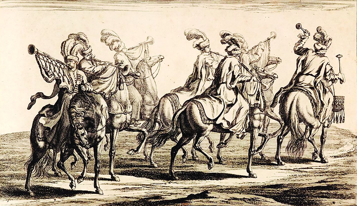 Трубачи и литаврщики в польском уборе на торжественной «карусели», посвященной совершеннолетию Карла XI в 1672 г.