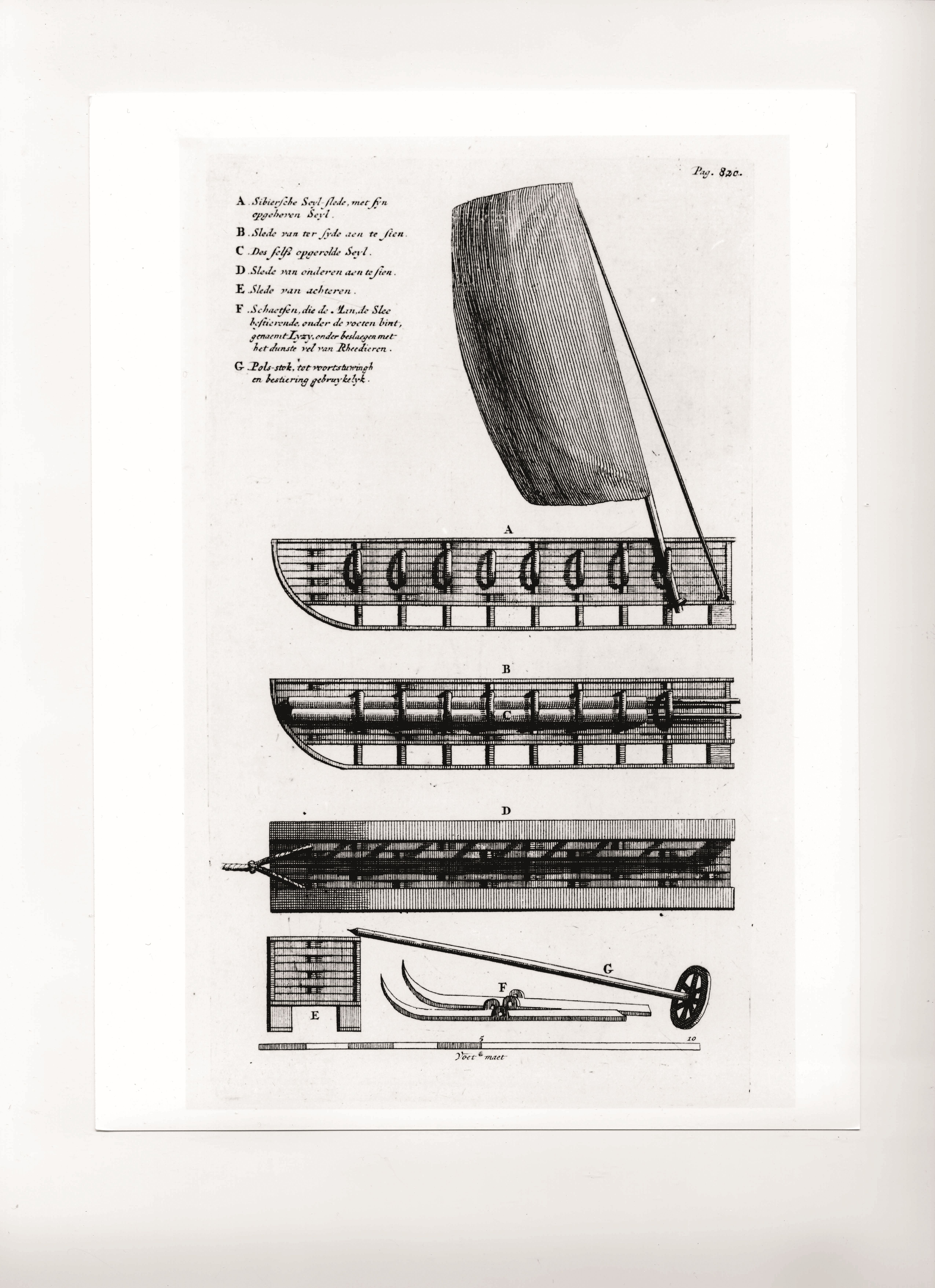 А — E. Сибирские парусные сани; F. Лыжи…, которые покрыты снизу тончайшей оленьей кожей; G. Палка, прикрепляемая к запястью и используемая для движения и управления [лыжами]