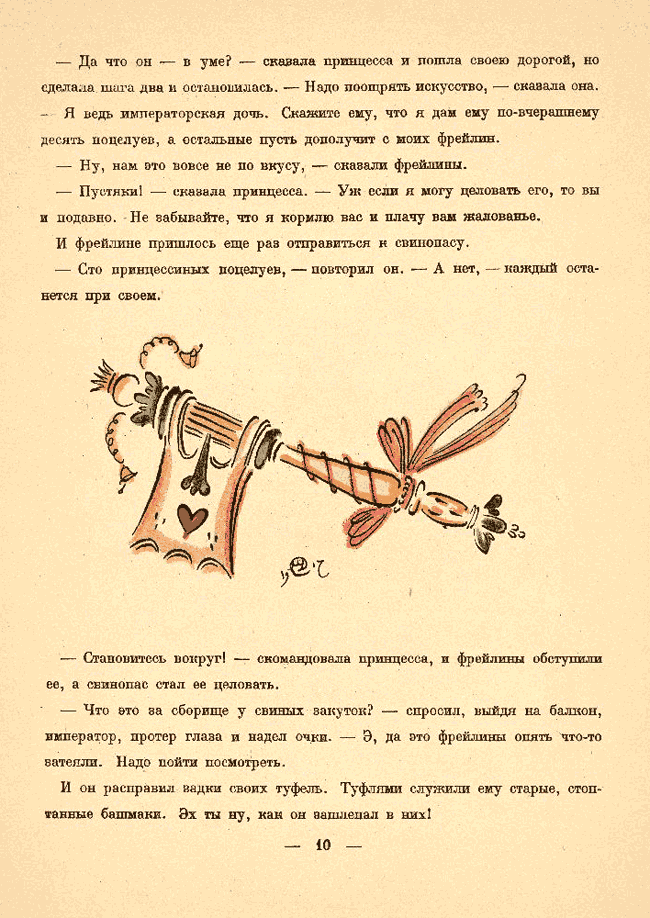 Фрейлины обступили ее и растопырили свои юбки; свинопас получил десять принцессиных поцелуев, а принцесса – горшочек. Иллюстрация в книге