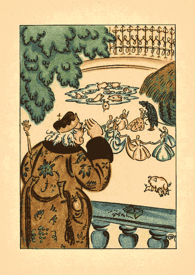 Фрейлины обступили ее и растопырили свои юбки; свинопас получил десять принцессиных поцелуев, а принцесса – горшочек. Иллюстрация в книге