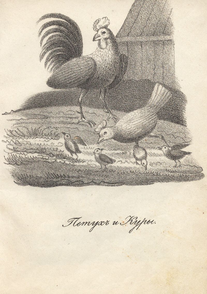 Петух и куры. Иллюстрация в книге