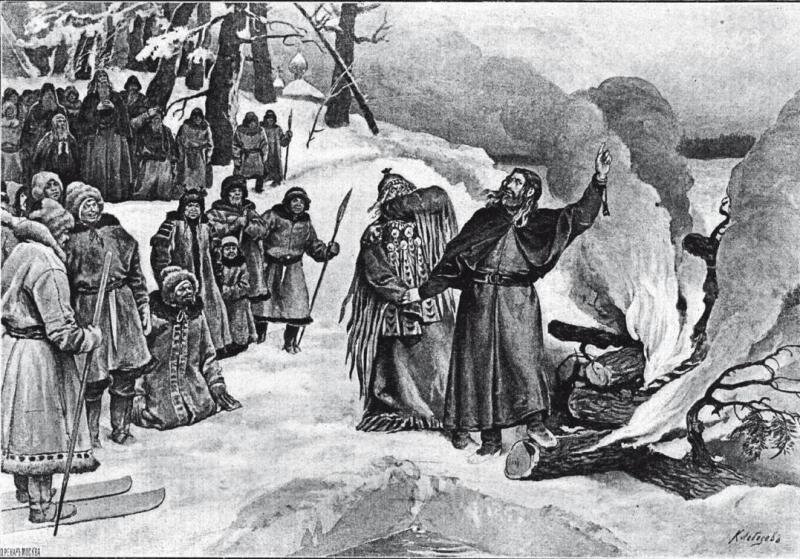 Св. Стефан Пермский увлекает за собой в огонь зырянского волхва Пама.