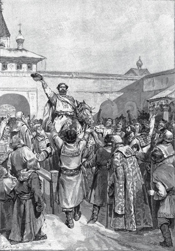 Мстислав Удалой въезжает на вече и избавляет новгородцев от грозившего им голода.