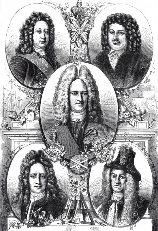 Граф Б. П. Шереметев, граф Г. И. Головкин, Светлейший Князь А. Д. Меньшиков, граф Ф. А. Головин, граф Я. В. Брюс.
