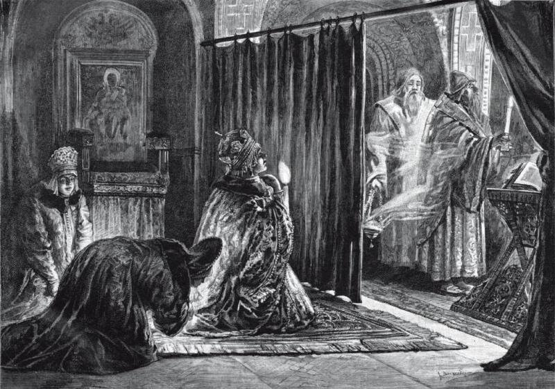 Царица и ее боярыни при богослужении в теремной церкви.