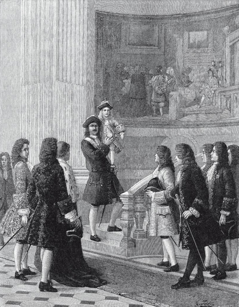 Император Пётр I несёт на руках малолетнего короля Людовика XV.