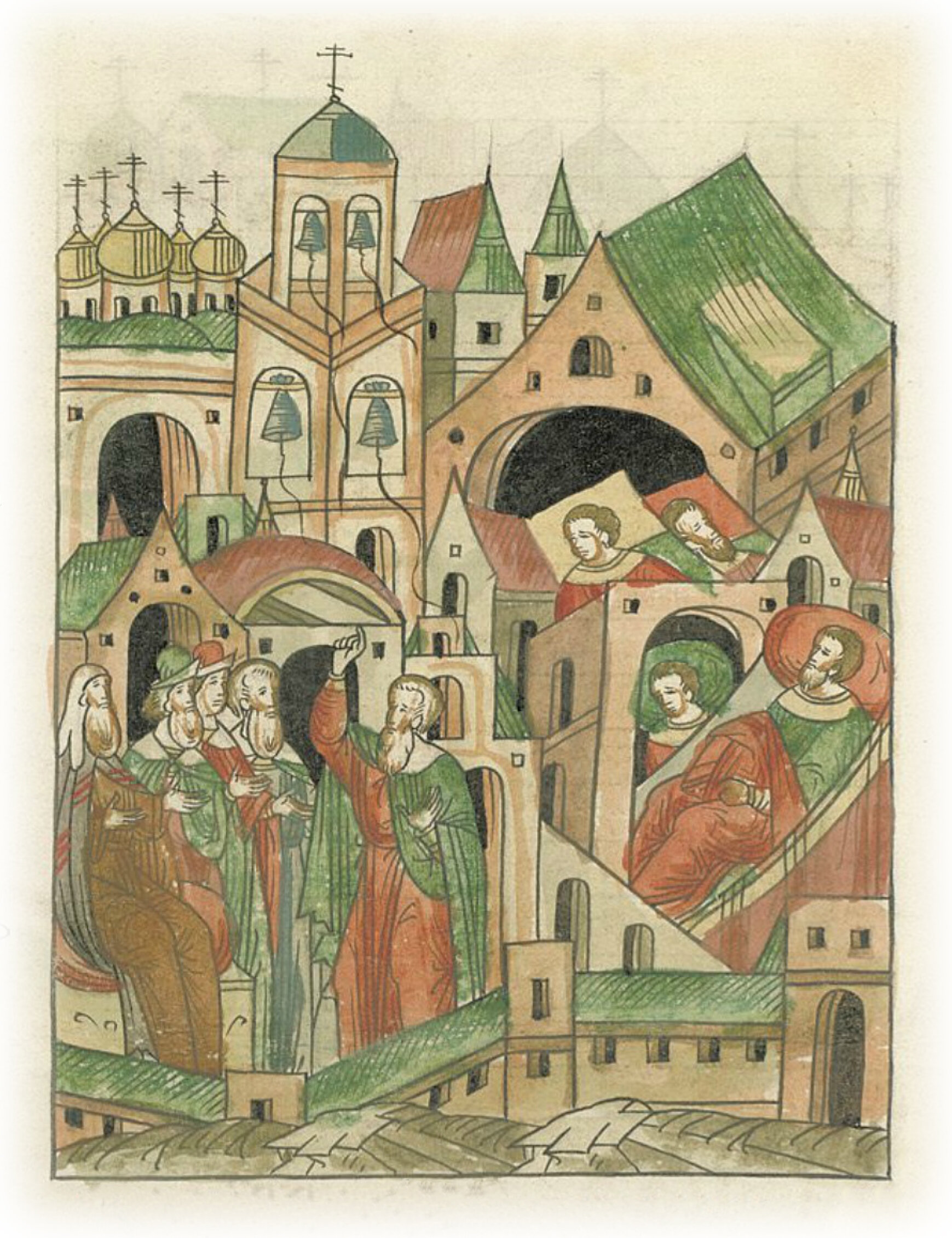 Месяца апреля в 11 день с четверга на пятницу ночью опять звучали; а слышал то Гридя, митрополичий ключник, а митрополиту говорил в ту пятницу ранним утром дворецкий его Сухан, а тут был Владимир да сын его Голова; да протопоп Федор Благовещенский тут же тогда был.