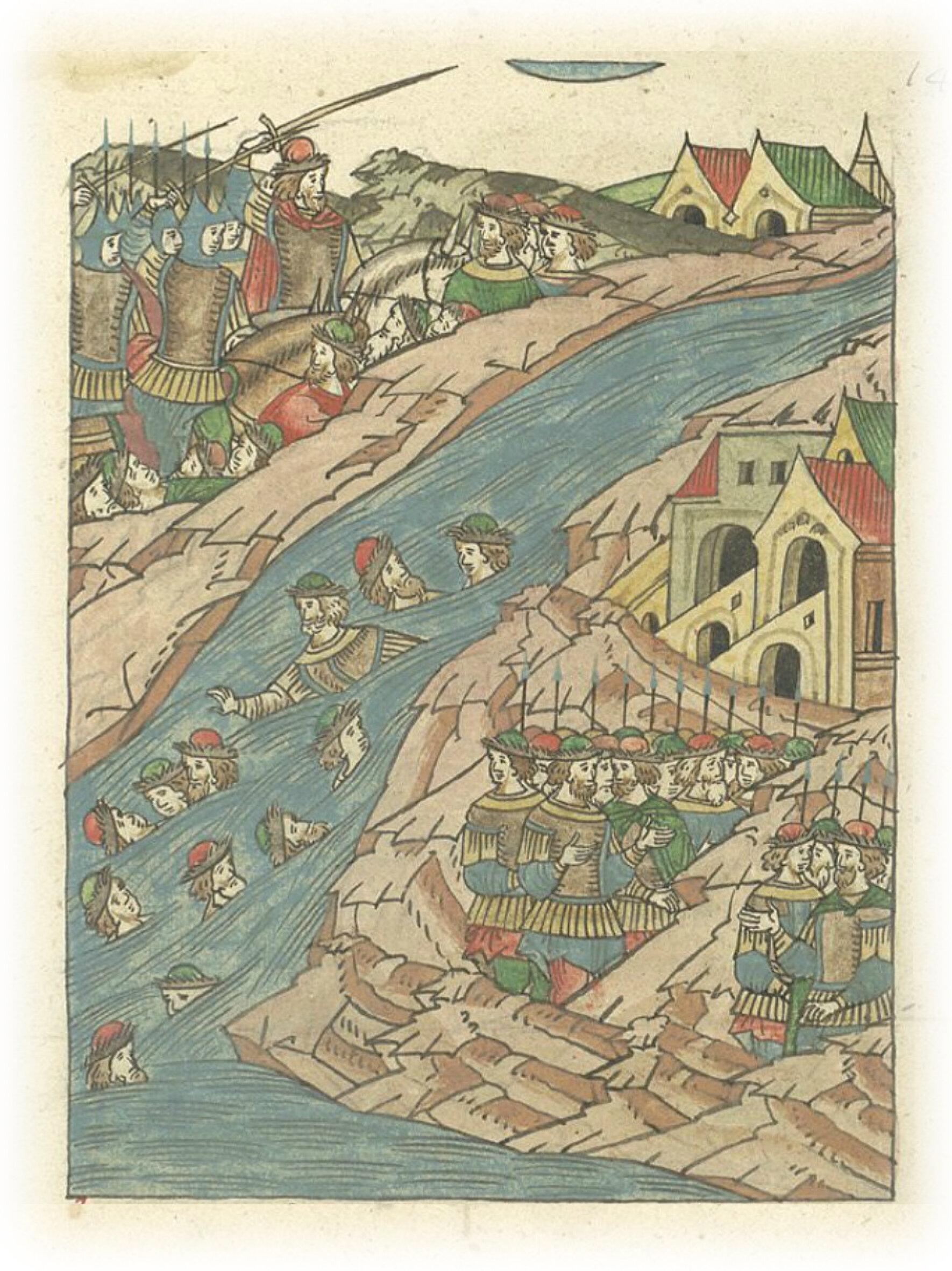 Они же, устрашенные гневом Божьим, побежали за реку Пьяну, тех, которые не успели убежать, убили, а некоторые утонули.