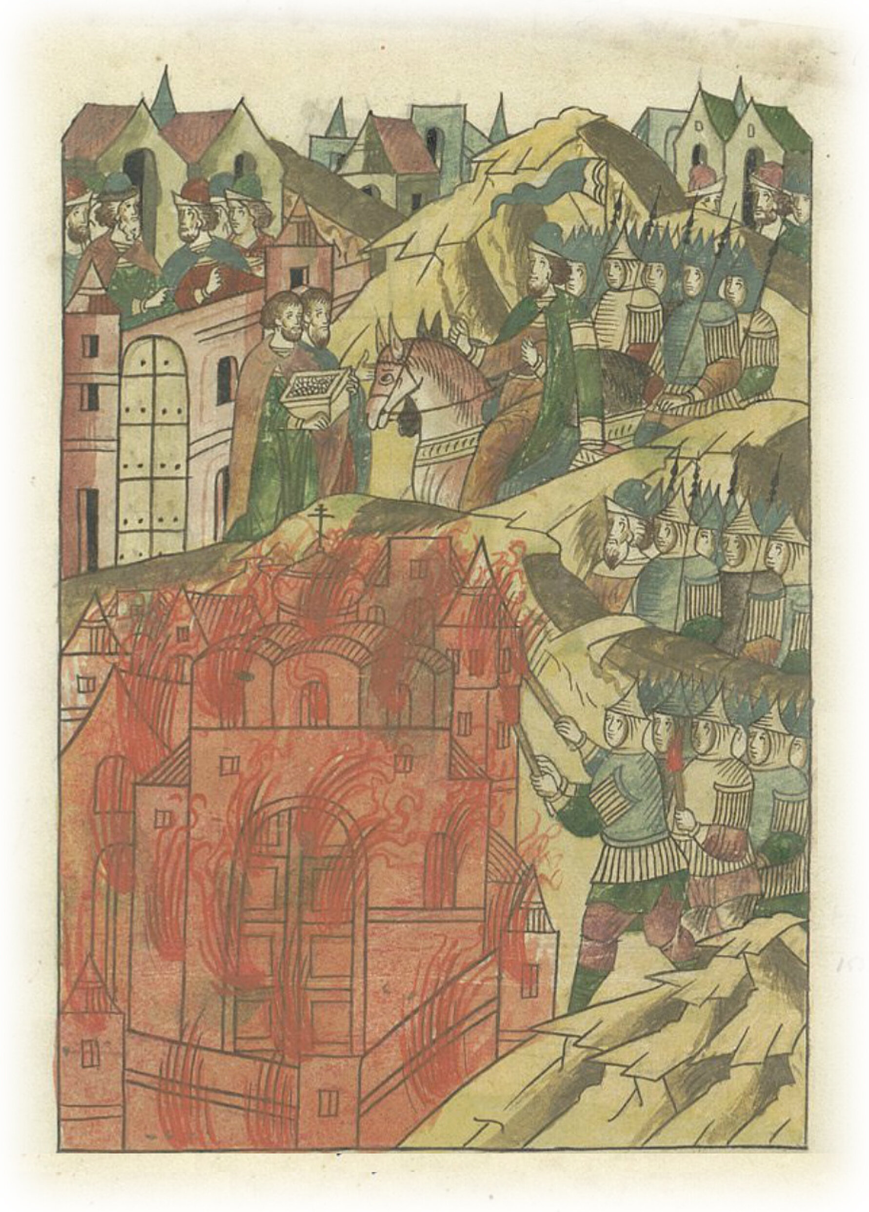 И в то время пришел из Городца князь Дмитрий, и, видя, что город взят татарами, послал им выкуп за город. Они же выкупа не взяли, а город сожгли, сгорела за грехи человеческие церковь святого Спаса и все ее сокровища, и сгорели ее двери, искусно сделанные из золоченой меди.