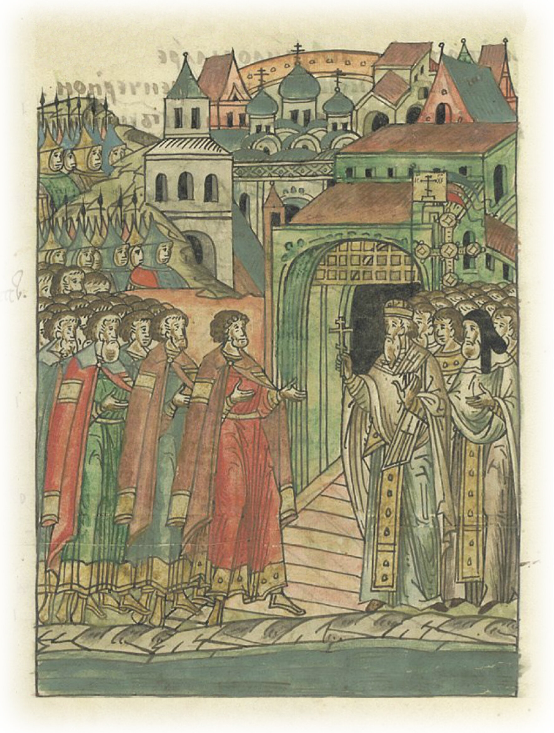 Коломенский епископ Герасим встречает великого князя Дмитрия Ивановича в городских воротах.