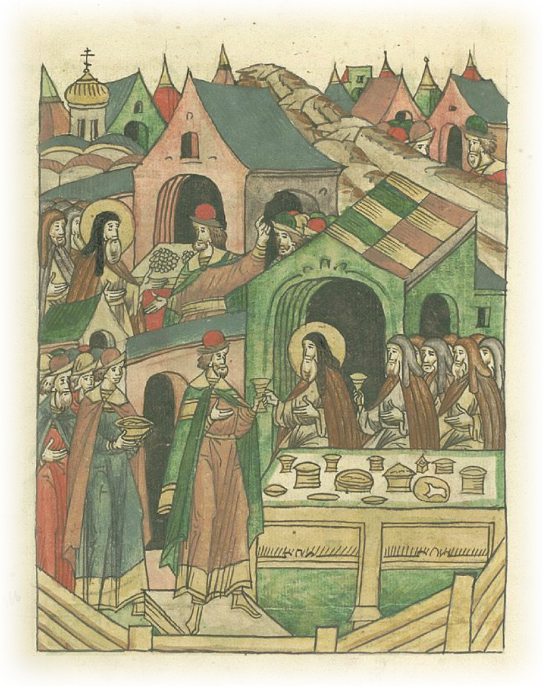 Великий князь Дмитрий Иванович, придя в монастырь к Живоначальной Троице к преподобному игумену Сергию, кормит братию, дает милостыню и просит игумена Сергия пойти от него посольством в Рязань к князю Олегу о мире.