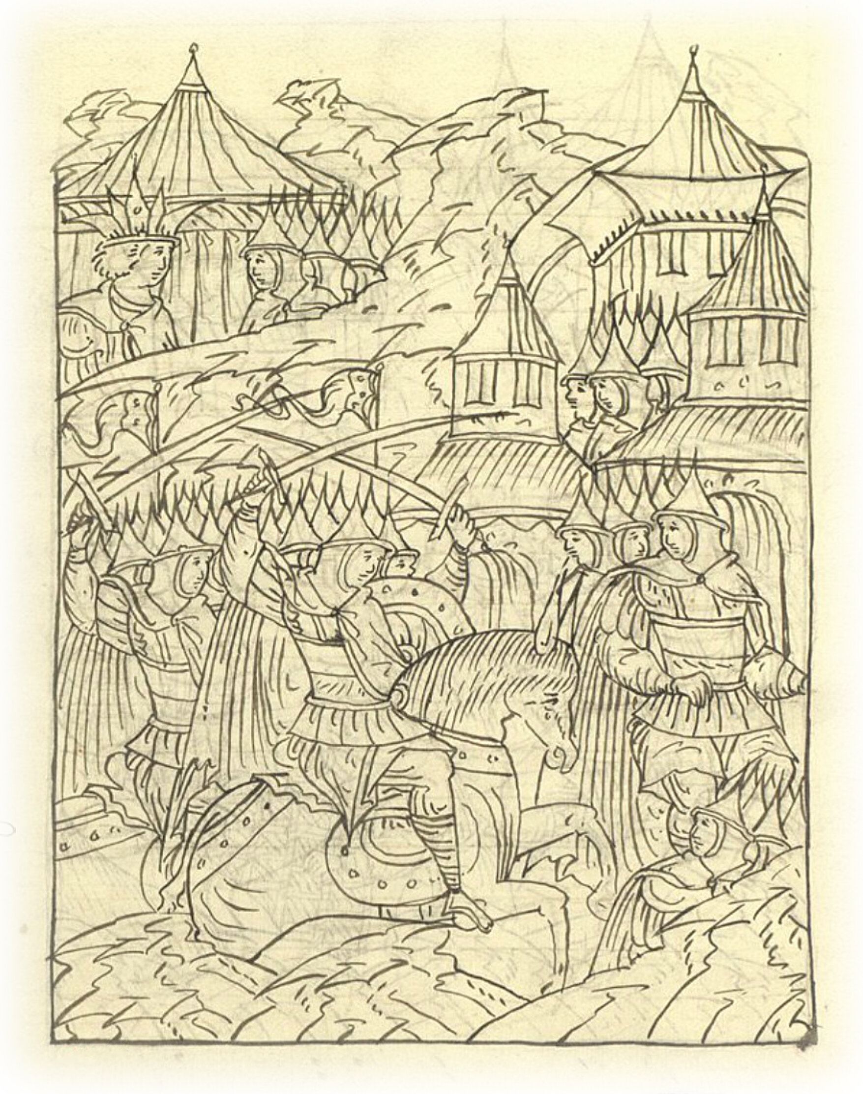 Из города же выходя, бились до полуночи, подходили к турам и бились в рукопашную. И с Божьей помощью побили нечестивых православные и в город загнали их.