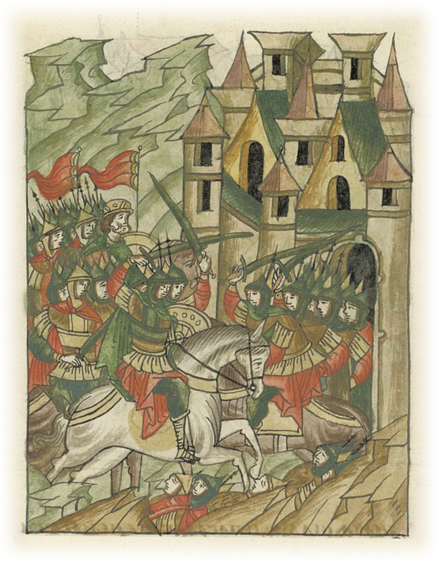 Они же, подойдя, осадили город, была битва суровая и сеча злая, простояли они около города десять недель,