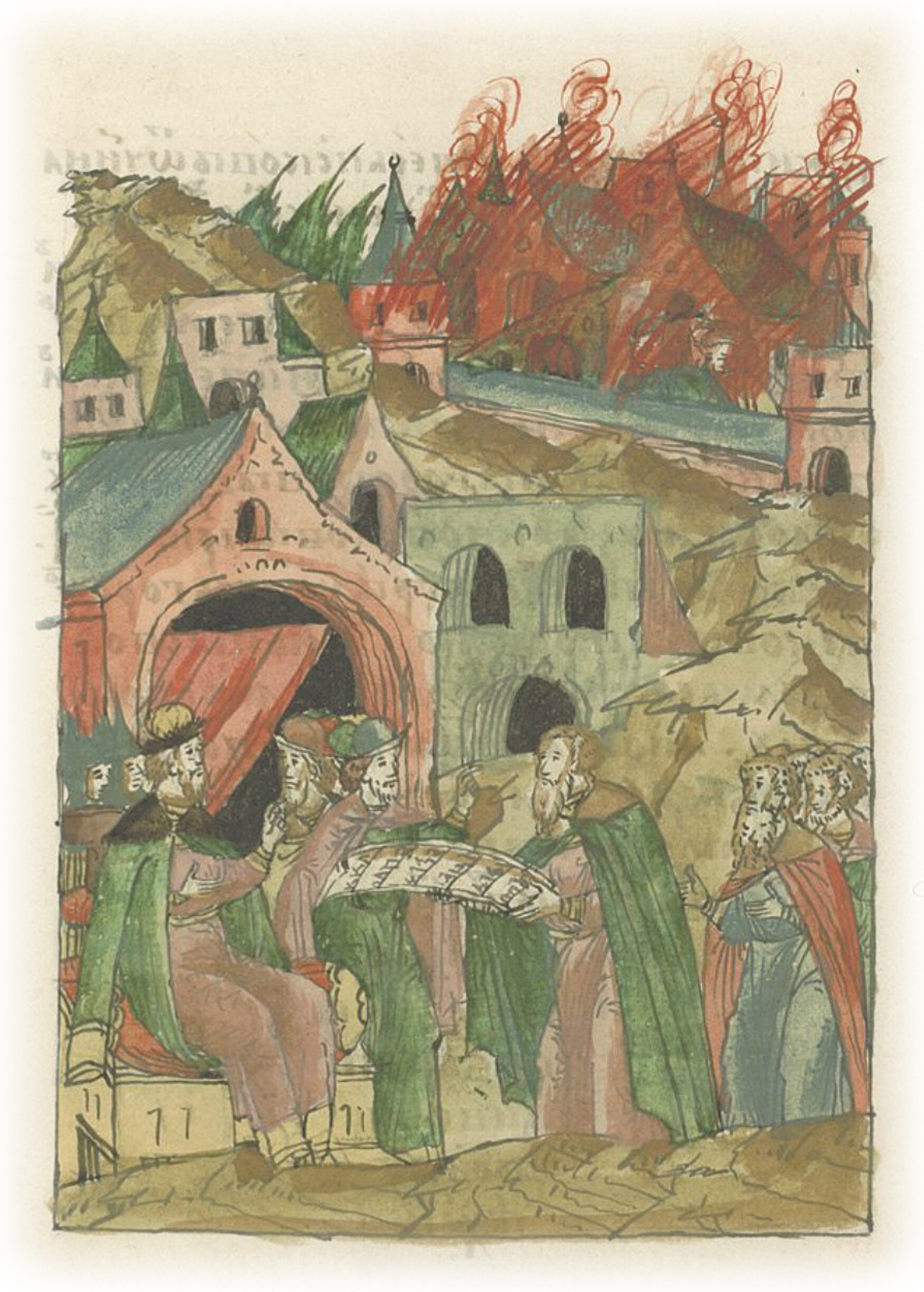 Месяца ноября во второй день в Турны приехал к великому князю от Пскова с грамотой Харитон Качалов, а в грамоте псковской писано: «Господину государю великому князю Ивану Васильевичу всея Руси посадник псковский степенный и старые посадники, и сыновья посадничьи, и бояре, и купцы, и зажиточные люди, и весь Псков, отчина ваша, своим государям великим князьям, Русским царям, челом бьем. По вашему, государей наших, велению, что во второй раз грамоту складную посылали к Великому Новгороду, и наши посланники в Великом Новгороде грамоту об объявлении войны положили, да и во Псков приехали. И нынче по нашим грехам весь город Псков выгорел, и мы вам, своим государям, со слезами извещаем о своей беде, а возлагаем упование на Бога да на вас, своих государей, а вам, своим государям великим князьям Русским царям, отчины вашей добровольные люди, весь Псков, челом бьем». И князь великий велел ему ехать с собою.