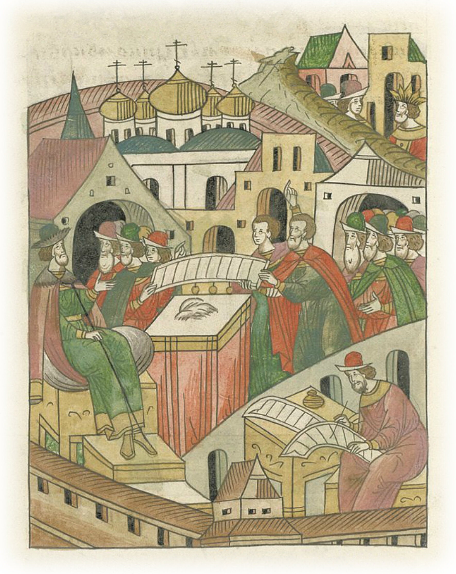 Князь Казимир с другими послами от Крымского царя Менли-Гирея пишут нужную великому князю Василию Ивановичу клятвенную грамоту.