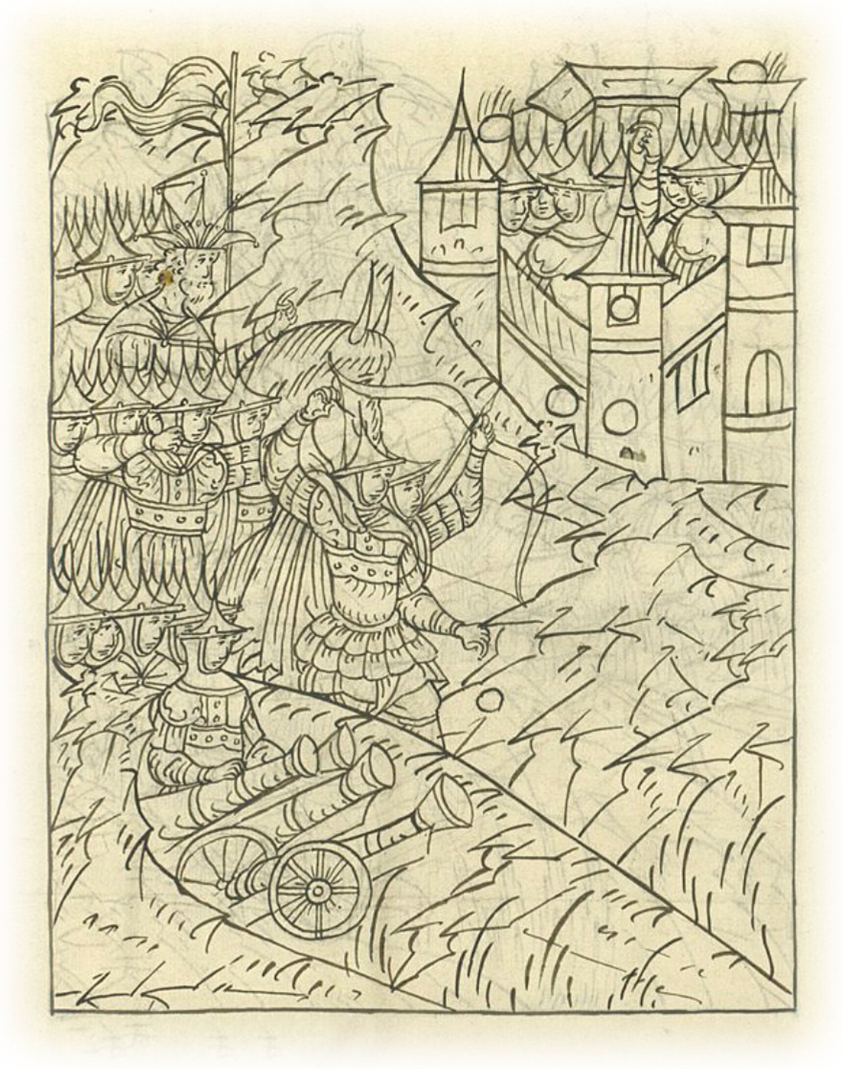 (Месяца) июня в 22 (день) в среду, в первом часу дня, пришел царь к городу Туле со всеми людьми и снаряжением. Когда наступил день, то из пушек бил по городу, огненными ядрами и стрелами обстреливал город, и во многих местах в городе дворы загорелись, и в ту пору царь велел многим янычарам Турецкого султана приступать.