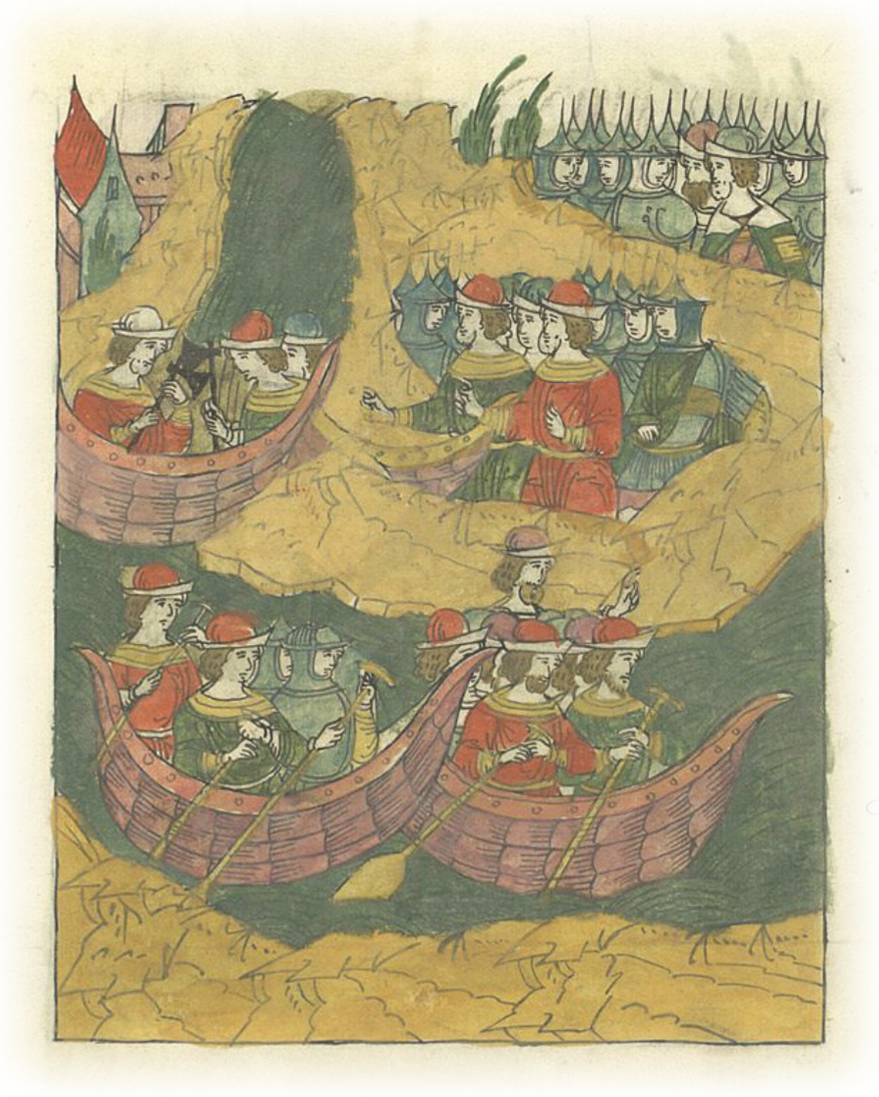 Дьяк с казаками приходит на реку Псел и строит суда.